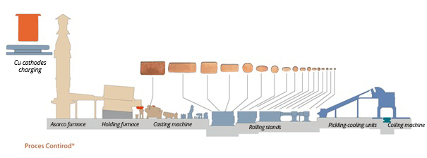 In the first phase of the Contirod production process the cathodes are fed to an Asarco melting furnace, which melts 45 tons of copper per hour at 1 120°C. The molten copper is then transported through a gutter system to a settling furnace with ca. 20 tons capacity. The liquid copper, dispensed into a Hazelett casting machine, crystallizes into a strand with 60 x 122 mm intersection. The copper strand, cast at the rate of 12 m/min and in 850°C, is then subjected to plastic forming in 16 roll stands. The final product is wire rod with 8 mm diameter, wound into coils weighing 5 tons and protected with a synthetic wax layer against secondary oxidation.
