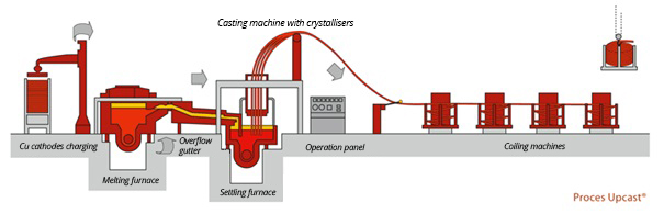 In the Upcast line, consisting of a cathode loading system, melting furnace, settling furnace, casting machine with crystallizers for vertical casting, and a coiler, oxygen-free copper wire is manufactured.