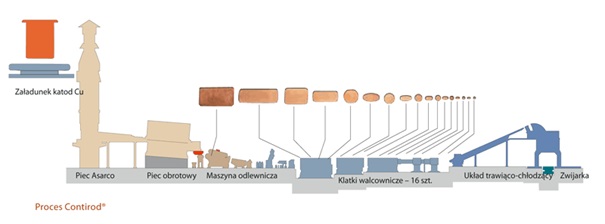 W procesie Contirod, w pierwszej fazie produkcji, katody trafiają do pieca topielnego Asarco, przetapiającego 45 ton miedzi na godzinę w temperaturze 1120°C. Stopiona miedź jest transportowana systemem rynien do pieca odstojowego o pojemności ok. 20 ton. Ciekła miedź, dozowana do maszyny odlewniczej Hazelett, krystalizuje się w pasmo o przekroju 60 x 122 mm. Pasmo miedzi, odlewane z prędkością 12 m/min. o temperaturze 850°C, jest poddawane przeróbce plastycznej w 16 klatkach walcowniczych. Produktem finalnym jest walcówka o średnicy 8 mm, zwijana w kręgi o wadze 5 ton i zabezpieczona warstwą syntetycznego wosku, chroniącego przed wtórnym utlenieniem.
