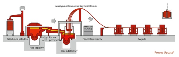 W linii Upcast, w której wyodrębnić można system załadunku katod, piec topielny, piec odstojowy, maszynę odlewniczą z krystalizatorami do pionowego odlewania oraz zwijarki, wytwarza się drut z miedzi beztlenowej.