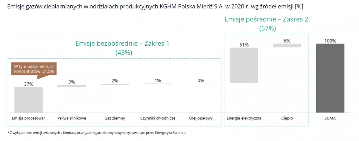 KGHM Polska Miedź S.A. nieustannie podejmuje szereg działań zmierzających do systemowego zmniejszenia emisji CO2. Troska o klimat oraz otaczające nas środowisko naturalne od wielu lat wpisuje się w strukturę zarządczą Spółki. Na przestrzeni poprzednich lat udało nam się wyznaczyć główne obszary, w których redukcja emisji w znacznym stopniu już nastąpiła m.in. uruchomienie nowego pieca zawiesinowego w Hucie Miedzi Głogów (zmiana technologii doprowadziła do spadku sumarycznych emisji CO2 - bezpośrednich i pośrednich - o około 25%), długookresowy wzrost udziału złomów we wsadzie (m.in. z wykorzystaniem pieca WTR w HM Legnica, przerób relatywnie czystych złomów wiąże się z niższą emisją dwutlenku węgla i wpisuje się w zasady gospodarki o obiegu zamkniętym) oraz usprawnienia technologiczne (np. w zakresie paliw).