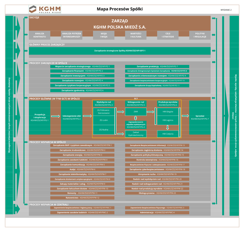 Zarząd Spółki wprowadził do stosowania w KGHM Polska Miedź S.A. "Mapę Procesów Spółki", w celu realizacji wymagań międzynarodowych standardów ISO funkcjonujących w Spółce oraz w ramach rozwoju podejścia procesowego.